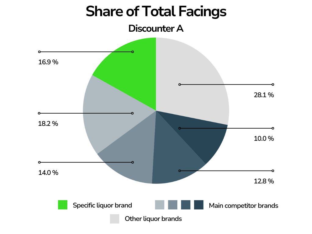 Looking at Discounter A in detail, it is noticeable that, despite the low placement rate, the specific liquor brand claims second place in the ranking of facings (16.9 %). So if it is available, it is extremely present in the competition with usually 2 facings per till. This makes it all the more important to improve the placement rate and expand this position.